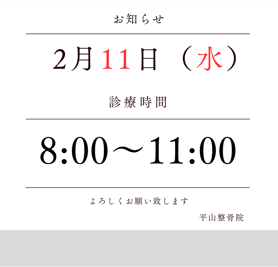 2月11日(水・祝)の営業時間は8時〜11時となります!