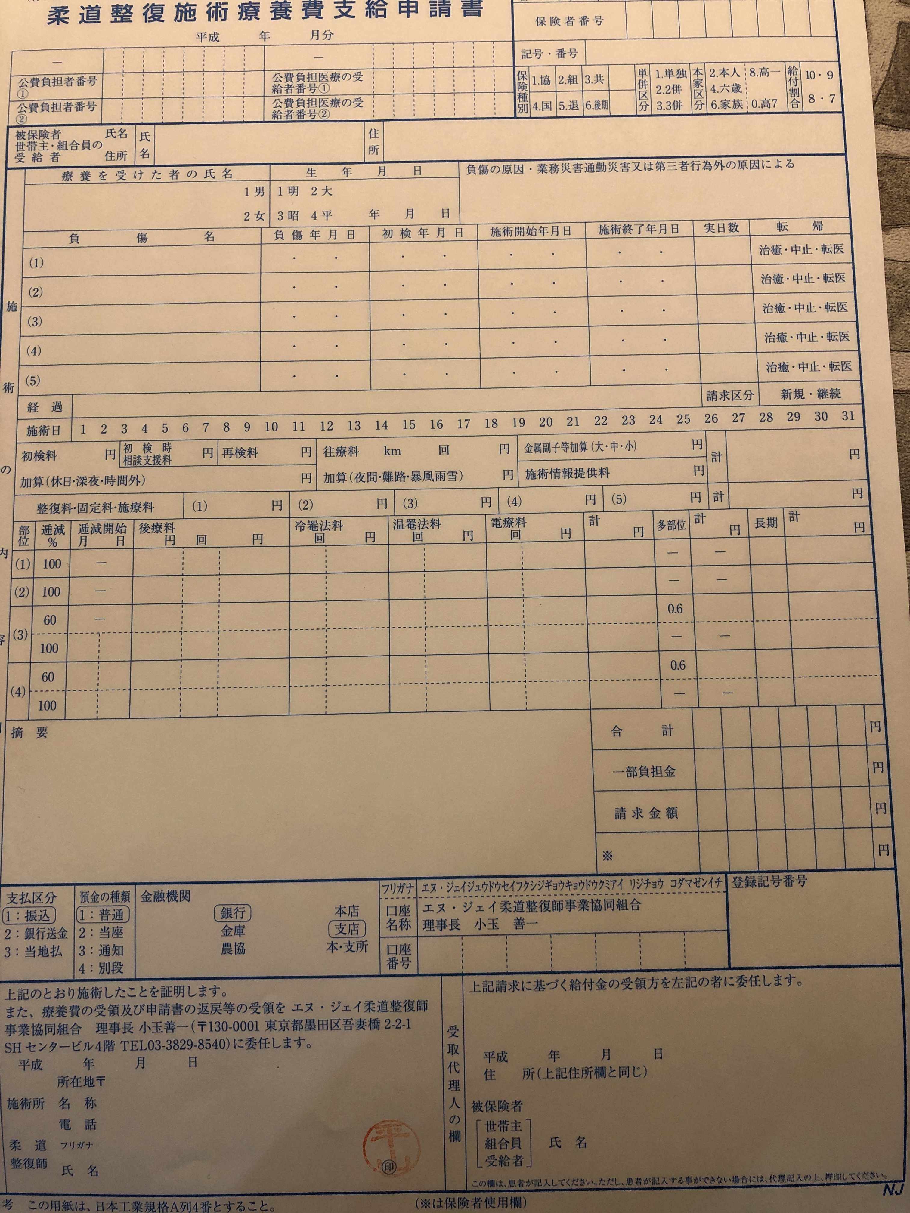 患者さんにかわって、私たち柔道整復師が保険者から請求するので、月に1枚レセプト用紙にサインをいただいています。
