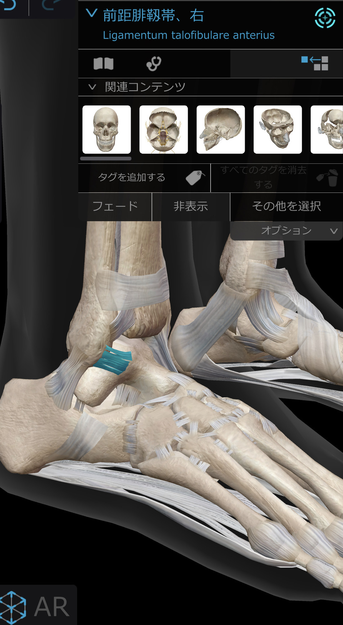 足での捻挫(内返し捻挫)では、前距腓靭帯を痛めてしまうことが多いです。