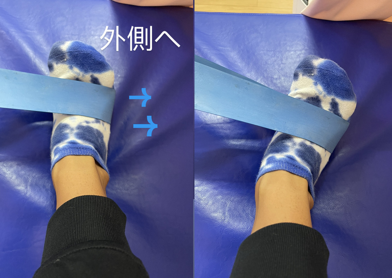 ゴムチューブを足の外側にかけて、外側に抵抗運動します。