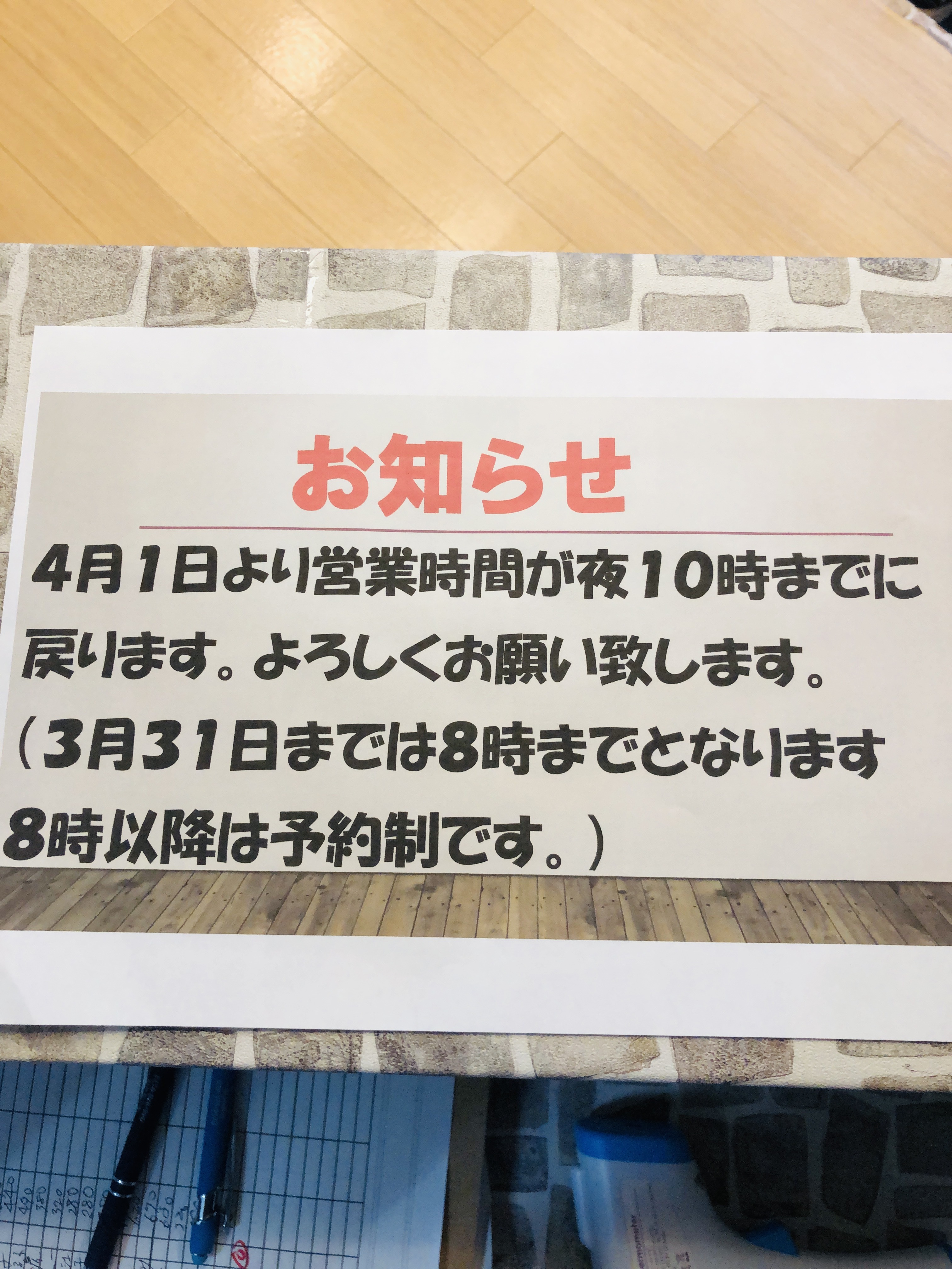 3月31日までは今まで通り夜8時までの受付となります。(夜8時以降の場合はお電話にて8時までにご予約ください)