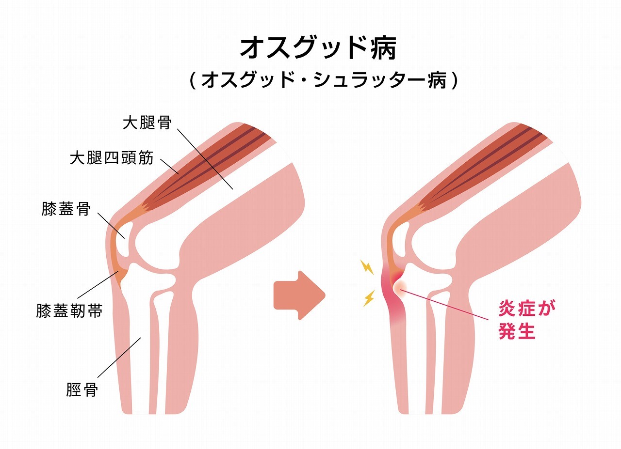 - 10歳~15歳程度の成長期で多く見られます。膝の前側が強く痛み、安静にしていると症状が和らぎます。