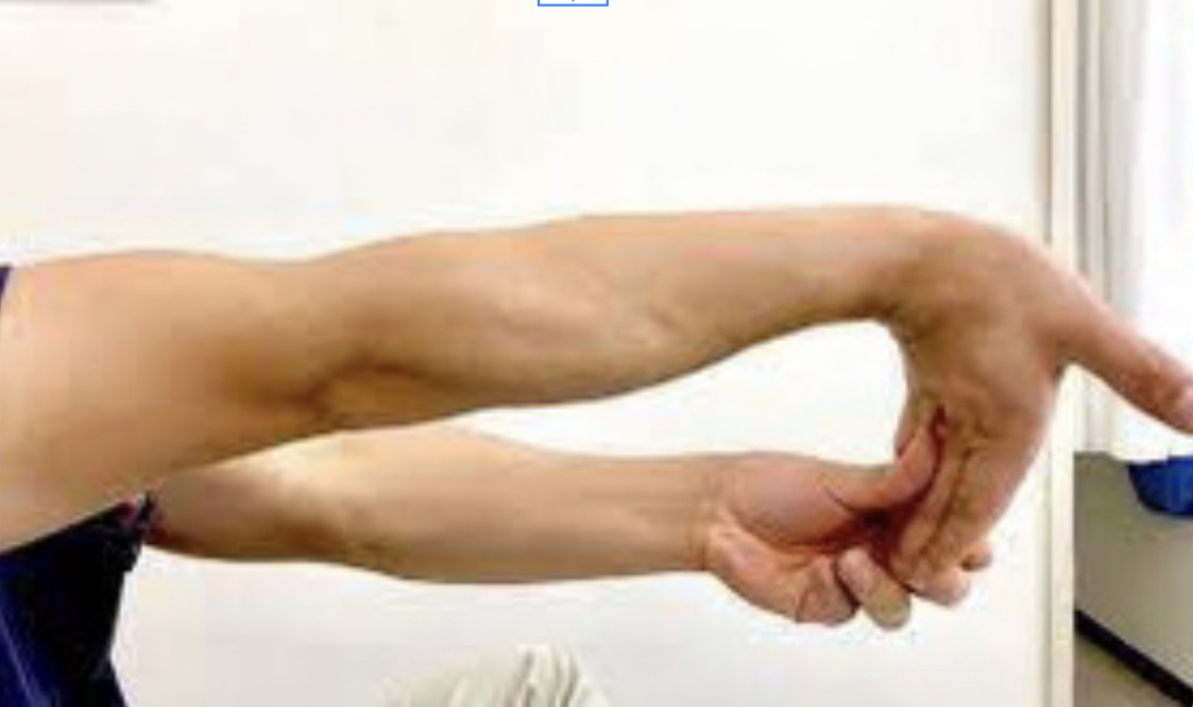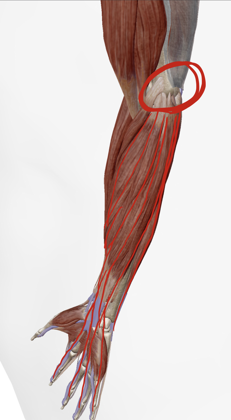 筋肉が腱となり骨につくのですが、手首を下げたりする動作をする筋肉が、指の方から肘の内側の骨まで伸びています。
